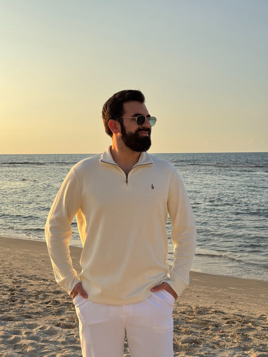 סריג פולו ראלף לורן עם חצי רוכסן בצבע לבן קרם