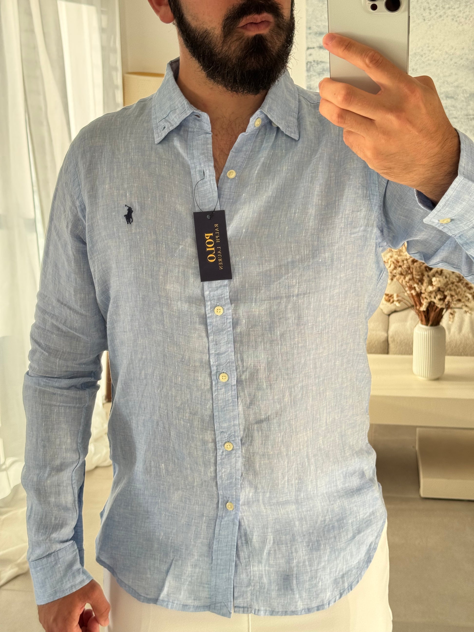 מכופתרת בטקסטורת פשתן פולו ראלף לורן בכחול שמיים לוגו כחול חדשה עם טיקט