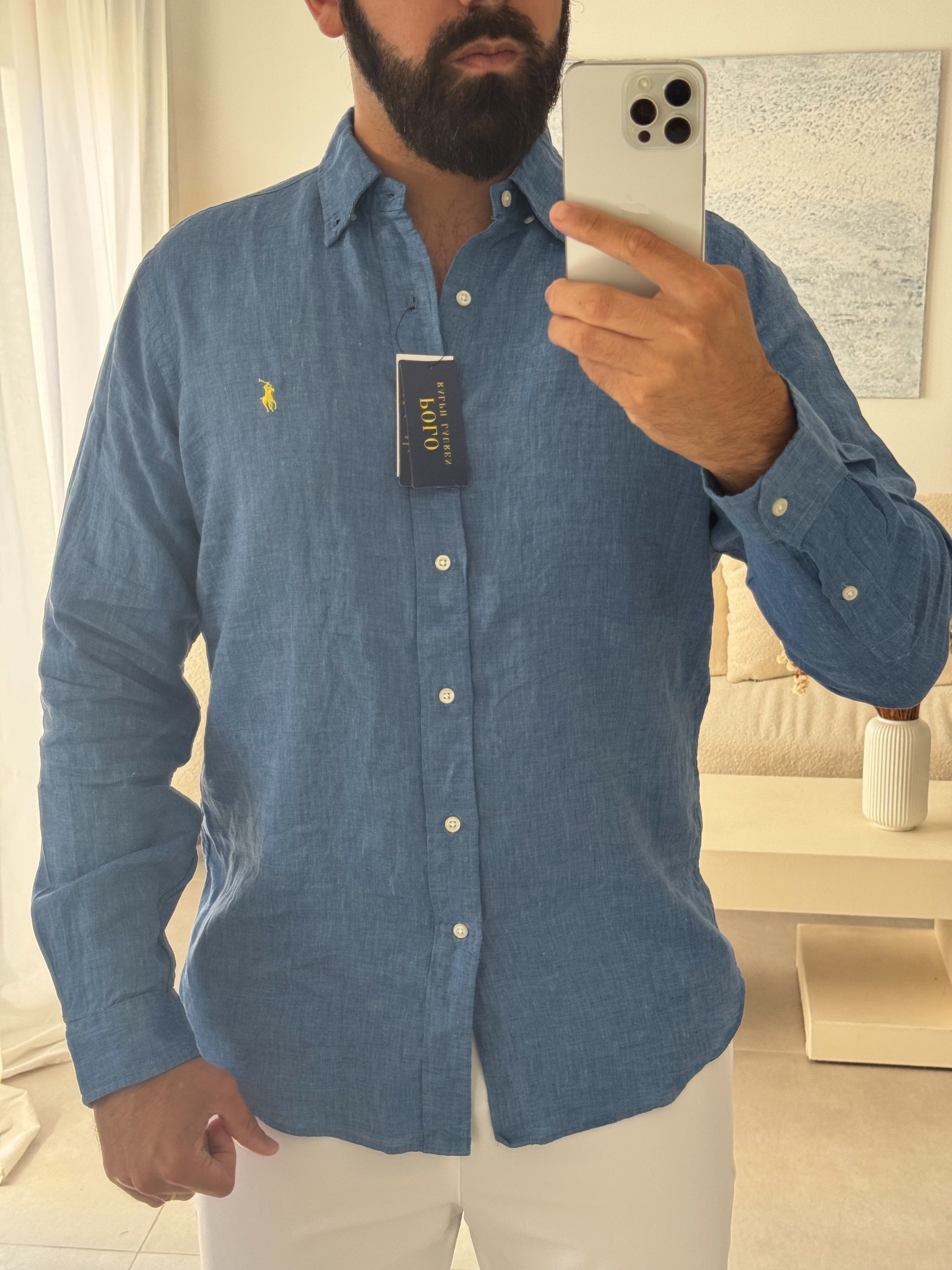 מכופתרת פשתן פולו ראלף לורן בכחול לוגו צהוב חדשה עם טיקט