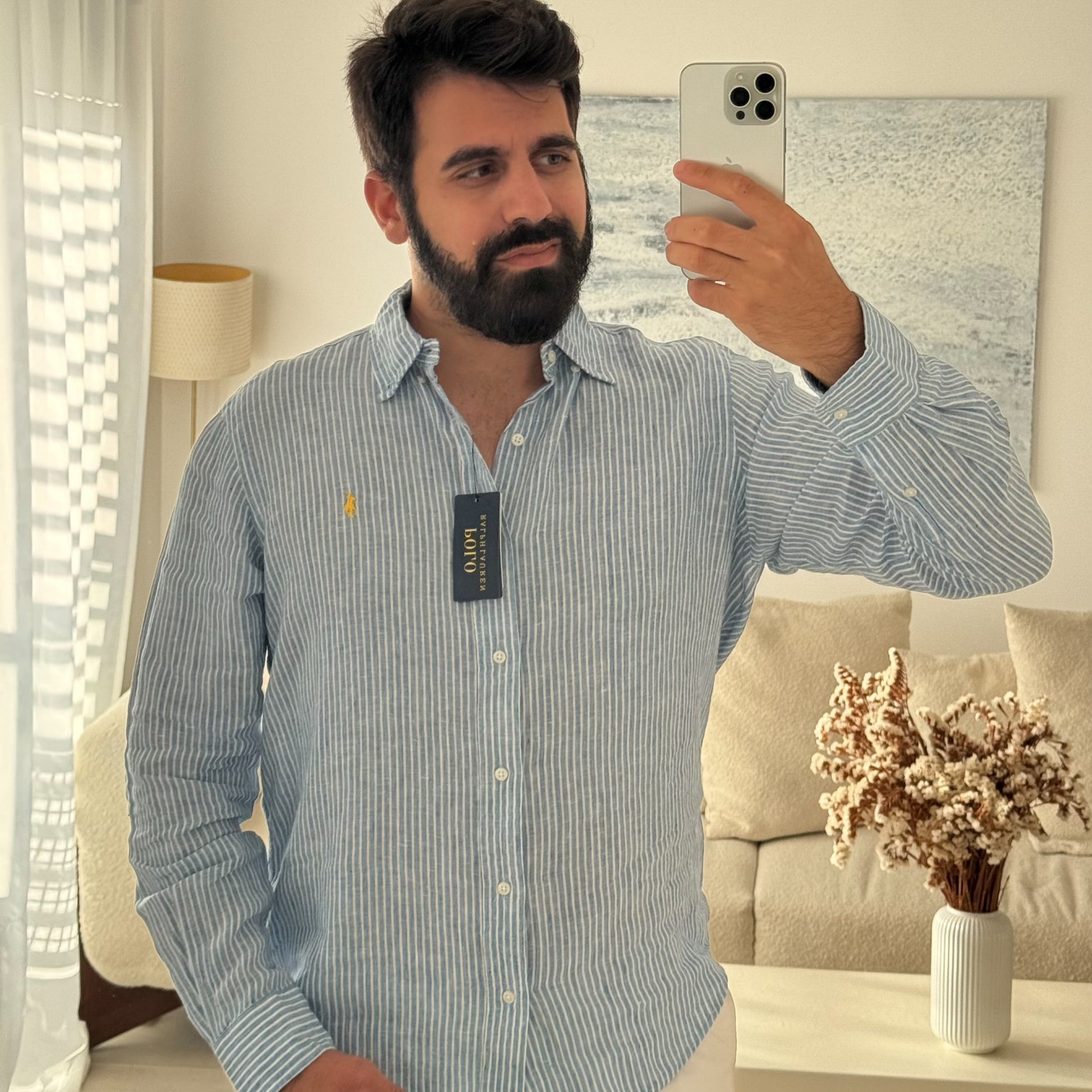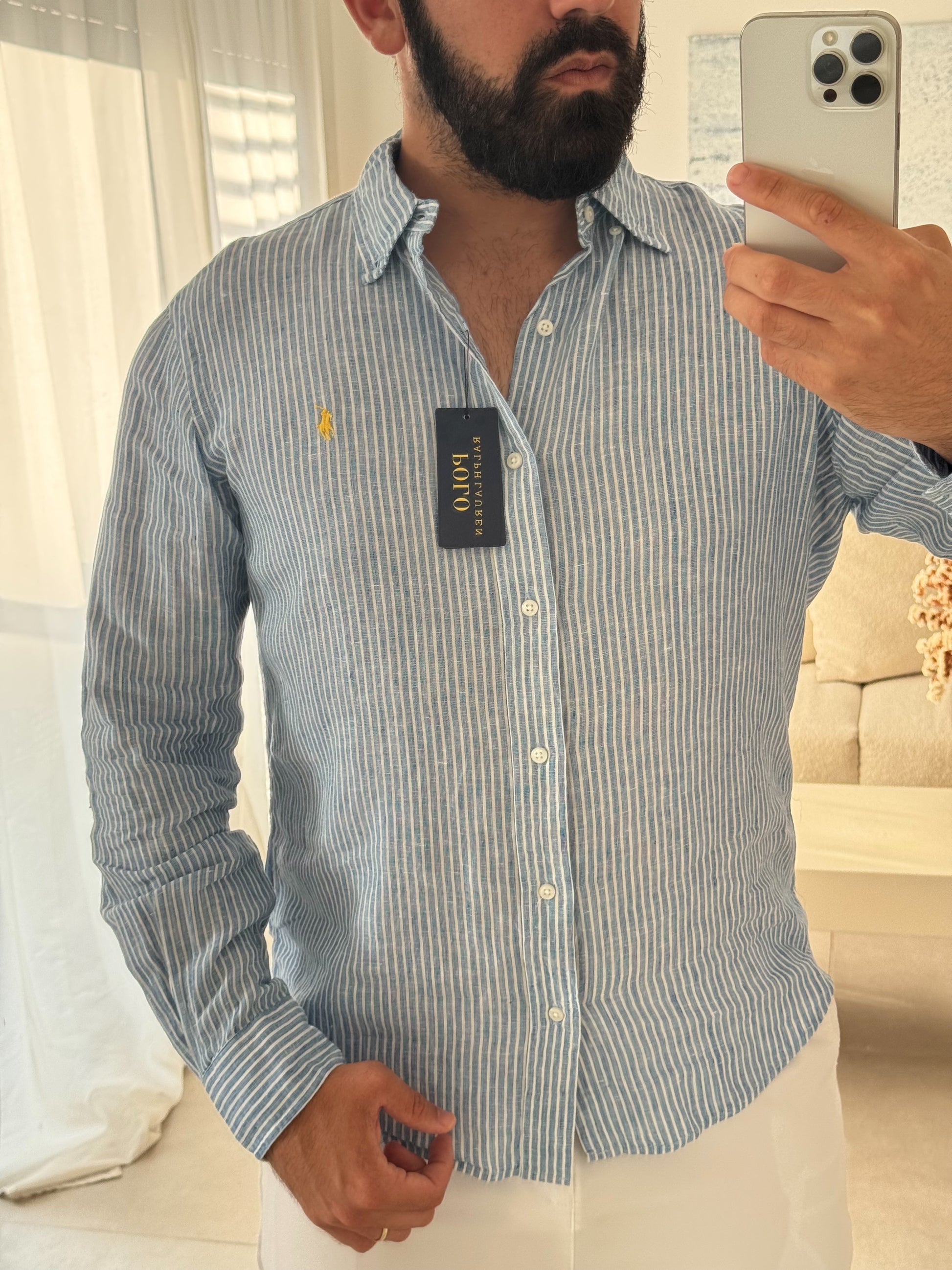 חולצה מכופתרת פשתן פולו ראלף לורן בפסים תכלת ולבן